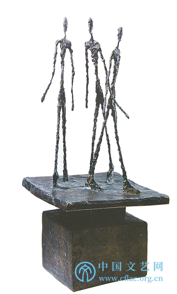 在贾科梅蒂枯瘦、焦灼、危耸、孤高的雕塑作品面前,我瞬间想到了青铜器蔡侯申盘内底的92个篆字:满行6字,凡16行,线条纵向拉伸,竖画细挺直上,几欲撑天拄地,又恨弱不禁风。至少依我管窥之见,在“抑宽扬长”这一造型手法或者说审美理念上,两者达成了艺术交集。就这样,西欧雕塑与东亚书法,奇异地实现了两千多年、万余公里的时空穿越。如果说这是类比思维或跨界联想在起作用,那么,如此貌似胡拼乱凑的方法,是不是也会创造出一些意想不到的惊喜效果?