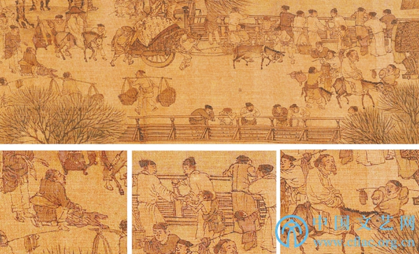 在城门东面的护城河桥一带,张择端还集中画了四个乞丐:第一位乞丐是残疾人,坐在离城门不远的地上向行人乞讨,旁边挑担的、走路的、伫立的,都同情地看着他,一位骑驴戴帷帽的妇女也回头注视着他;第二位与第三位乞丐是一大一小两个孩子,他们伸手向栏杆旁观景的人乞讨,一位观景者侧身递右手给了大孩子些钱;第四位是在骑驴老者与牛车之间失去双臂的乞丐。诚然,乞讨现象在哪个时代都有。宋徽宗即位初期,曾接受宰相蔡京的建议,在全国范围内推行“慈善制度”,建居养院照顾鳏寡孤独者,建安济坊收养贫病交迫者,建漏泽园安葬贫无葬地者,但真正获得实惠的人少之又少。官方记载,宣和二年(1120年),汴京一次性赈济的贫民、乞丐多达22000人。虽然客观情况的确如此,但是在宋代著名风俗画家,如朱锐、李唐、苏汉臣等人的笔下是看不到这一类题材的。他们创作了以劳动者、小市民和儿童生活为题材的风俗画,如朱锐画《骡纲困》《盘车图》《运粮图》《春社醉归图》等,李唐画《放牧图》《灸艾图》《雪天运粮图》《春社醉归图》等,苏汉臣画《货郎图》《戏婴图》《百子嬉春图》《渔村聚乐图》等。这类画不仅为老百姓喜闻乐见,对于统治者来说,也因其粉饰太平的特点而备受喜爱。所以,张择端敢于在画中直面现实的阴暗面是要有勇气的。