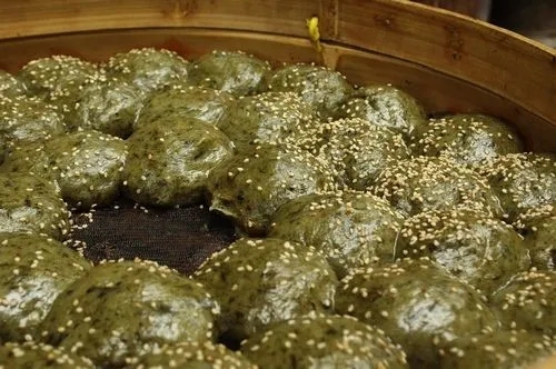 接着,和以煮熟剁烂的佛耳草,加适量的水和成面团,包馅成饼。馅料有赤豆沙和黄豆沙两种,再加上用糖制的猪板油丁和核桃肉。在饼的外层撒上芝麻,用猛火蒸煮。