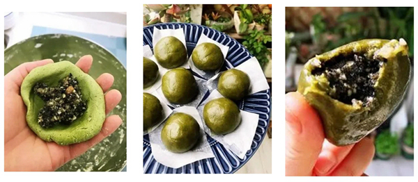 艾草泥剁好后,用煮艾草的水,加上糯米粉一齐和拌成团,把准备好的芝麻、眉豆、花生等馅料包进面团里,再封口捏成圆形、长形等形状,放入锅中隔水蒸15至20分钟后,即可出炉。