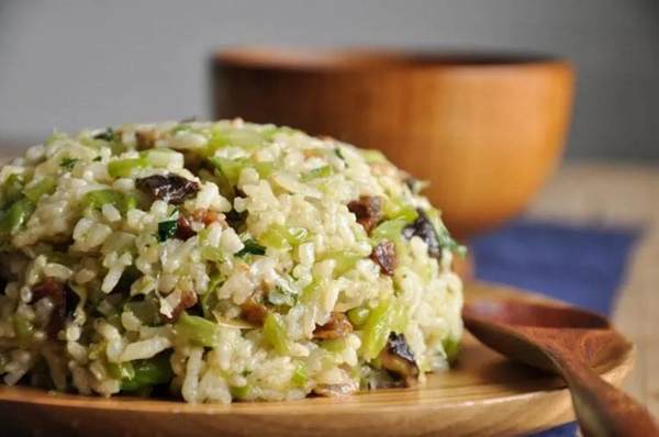 先将糯米煮成饭,把芥菜嫩叶切细备用;把切好的猪肉倒入炒锅,煎炒出油,再倒入芥菜与肉同炒,炒之熟后,把糯米饭放入锅中同猪肉芥菜一起猛炒、拌匀;最后放盐、味精、虾皮、香菜等佐料,焖一二分钟,即可起锅。
