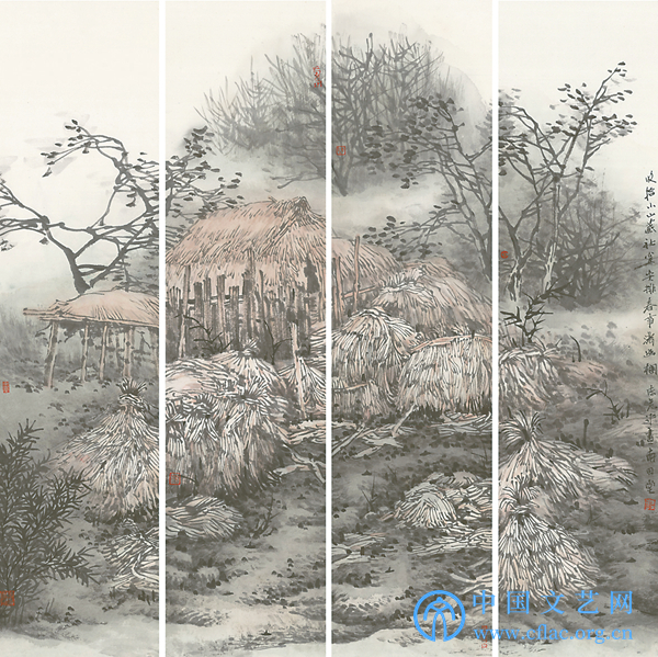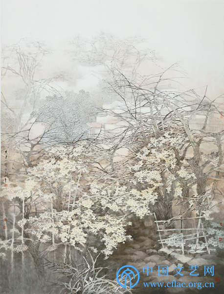 图像性让他更注重画面整体的调性把握。但这种调性不是西画之中光色变幻的色相统一性,而是湿润的水气所形成的化不开的烟雨、烟雾的调性统一,这让他在平面之中进行细微而深入的烟雾晕染,从而形成了柔和、婉约、朦胧、迷离、恬静、虚和的田园意境。他的这些画作很少使用传统工笔山水的石青、石绿,也不过分凸显勾线,而是以墨色为基调,将春天田野到处绽放的油菜花的鹅黄色、杏花的粉色和绿树初叶的嫩绿色融入其中,通过墨色弱化江南初春缤纷的色彩,既使画面整体色调统一,也通过这种墨与色的关系的不断调整使整个画面更显江南烟雨的迷离。陈危冰的这些田园之景在近景处理上,极尽精微,他从沈周、仇英的小青绿着色法以及田园山水的树木勾染得益最多,甚至是工谨之中体现出一种随兴和静逸,这些勾线虽起到画中之骨的作用,但线骨却自然融入晕染与色彩之中,绝不脱离丛林灌木而显露于外。这是陈危冰江南田园山水最鲜明的艺术特征,他既不断通过晕染衔接树木、田野、农舍之间的边界,也不断通过晕染调整远近景之间的距离,甚至减淡近景色相,让画面始终处于烟雾的笼罩之中。