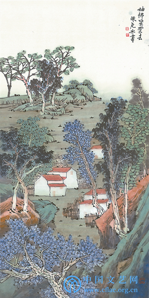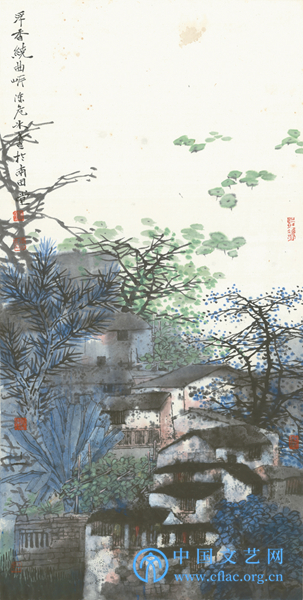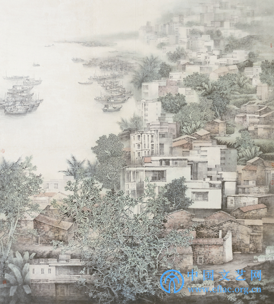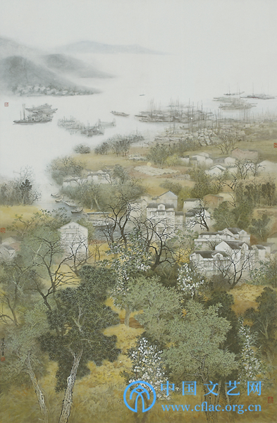 陈危冰对江南田园烟景之色的强化,既形成了他个人的艺术风貌,也通过现代图像经验改变了传统青绿山水那种被间离的装饰性,而这种强化的内核则是出于他对江南现代田园意境的营造。一方面,在《渔港春色》 《东方风来满眼春》等作品里,他试图将现代城市景观融入田园诗境,在此表明物质生活的极大提升并未改变人们对古代诗意江南的沉迷;另一方面,在《更在江清月冷中》 《家园》和《青山澹冶》等作品里,他又排斥对现代人文景观的描绘,而着意于纯自然的田园风物描绘,仿佛通过这种儿时记忆中留存的、已经在现代文明中消失了的江南田园景致来唤醒人们对田园生活的美好怀念。他作品里始终渲染和营造的这种虚幻的烟景,实际上揭示了现代文明与农耕文明的一种深层关系,这就是人类所创造和享受的现代文明并不能完全解决精神归宿问题,人与自然的统一性是超越文明进化程度的,所谓“乡愁”在此已不是某个人对家乡故土的怀念,而是人类在现代文明迁徙中对曾经赖以生存的家园——田园的一种永远的精神依存。陈危冰不断描绘的这种田园,不仅有沈周、文徵明、仇英、董其昌等明清文人对隐逸田园生活的向往,而且这种田园景致所象征的生活方式也成为现代社会的精神家园。而陈危冰不断晕染的江南烟景,则更加凸显了现代图像对工笔山水真实情境的映射。