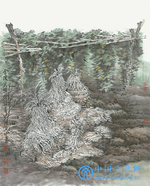他的这些工笔山水较少通过山石构筑画面的起伏变化,而是拉近镜头,半俯半瞰乡村的农舍田园,占据画面主体的是树木苇草,画面构图的变化完全通过纵横交错的溪水、田埂和枝桠伸展的各种树木来完成,画家在此试图通过这些截景的田园元素来替代传统山水画中三段式的山水形貌关系。正是这种近景取景的变化,才让他改变了传统青绿山水那种以表现山石为画面整体的勾圻之法,从而将工笔之勾染转移到树干、叶片、芦苇、蔬菜的描绘上。在某种意义上,他借鉴了花鸟画如何绘写枝叶的技巧,其图式是把花鸟置入山水之景的一种全新创造。从现代视觉经验来说,陈危冰画的不是被折技或被勾皴的花鸟与山石的装饰化形象,而是让在平面中被间离的花鸟、山水回到自然的视觉经验中,并以镜头图像的截景边框来体现图像被镜头随意调度的视觉经验,半俯瞰的取景显现了相当完整的视线角度变化。因而,他的工笔山水也成为工笔风景的一种聚焦观赏。