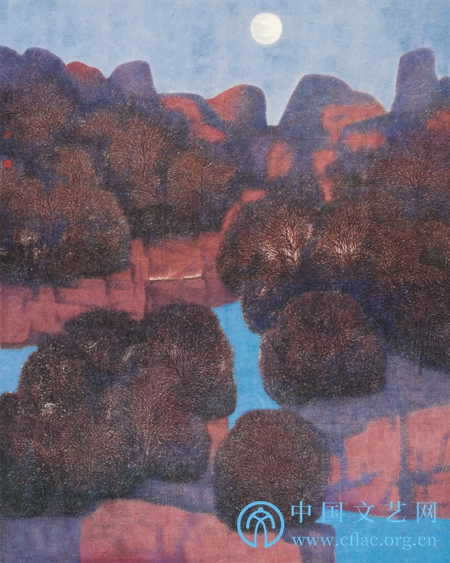 刘云早年以油画为擅场,他的《月魂》与《大江南》系列作品,以高旷的胸次、涤尽尘氛的眼光,未尝斤斤于画面细节的描摹以媚悦俗目,乃专以诗性的语言,带着中式的哲思,营造着一种恬然杳渺的人域幻境。我于是便想,彼时作为油画家的刘云似乎已经具有了一个文人的担当,开始悄然地关注起中国山水画的发展命运了,于个中兴衰,或竟了然于胸。不然,他何以要改弦易辙、放弃缤纷的油彩而纵情于古老的宣纸,并且是以异军突起之势直面问题,得以别样的艺术情思融入纸墨之间。