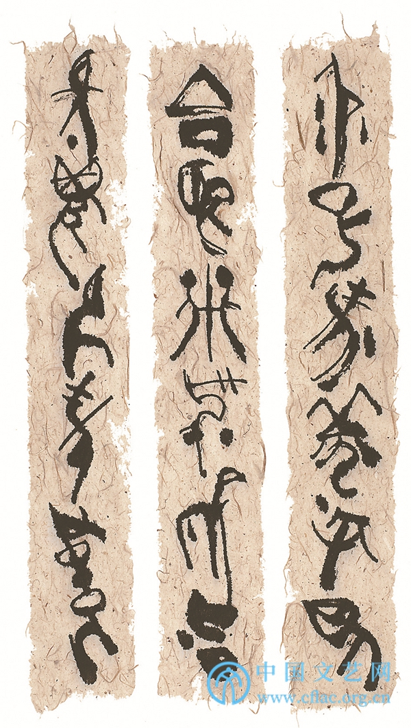 从“天书”的创作出发,韩美林所要的不再是“形”而是“神”,不再是“体”而是“魂”——韩美林说,他愈加体会到“学会欣赏‘古老’的、‘民族’的美,才能创造出中国味的现代的美”——纳天为书,“从‘下里巴人’到‘阳春白雪’,我的艺术一定要再回到‘下里巴人’。”