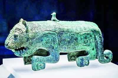 老虎的形貌凝结在了文物上,老虎的神威融化进了精神文化里。在文物上,能看到造型各异的老虎。食人卣,是中国商代晚期的青铜器珍品。称之食人卣,是因为一只老虎与人相拥在一起,而且人头紧挨老虎的下巴,老虎张嘴就可吃掉人。有人并不赞同这种说法,认为置身老虎怀抱的人,丝毫没有恐惧感,满脸温馨,像是享受老虎的哺乳。无论如何理解,在这件文物上,人与老虎是一个密不可分的共同体。