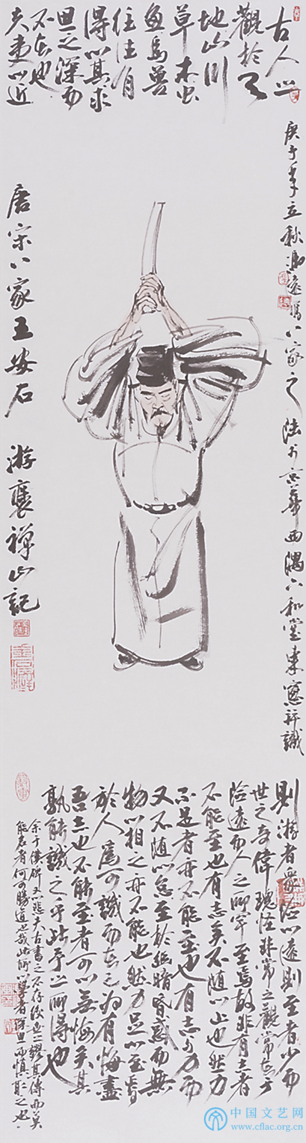 冯远的人物画“唐宋八大家”系列,比之“先秦诸子”系列,笔墨更为开张、简练,凸显出文人放达的性情和复杂的性格。韩愈、柳宗元、苏氏三父子、欧阳修、曾巩等人,文章盖世,事功惊人,复合型的身份让他们在政治与文章中游走,人格饱满又深刻。“唐宋八大家”系列的书法长跋让人耳目一新。当代国画的书法缺失,早已引起有识之士的忧虑。没有毛笔字题款的国画作品,会降低当代国画创作的品质。因此,要求当代国画家提高书法水平的呼声越来越高。冯远注重书法的研习,注意书法对画作的促进与提升。1977年他在浙江美术学院攻读研究生,三年的系统学习,让他认识了神秘而博大的传统艺术世界。浙江美术学院(今中国美术学院)重视书法,是最早设置书法专业的美术学院,当然要求美术学院学生也要学习书法。冯远在青少年时代染指丹青,也弄翰墨,进入大学,勤于临帖,铸就了自己的笔墨功夫。他的画作,书法占比较大,“唐宋八大家”系列就是证明。他大幅度题跋,有的是抄录所绘人物的诗文,有的是书写个人的感受、感想,以不同的文辞,不同的书体,强化画作的文化含量。书法对国画有文辞和笔墨的双重推进,前者是主题深化,后者是艺术手段,这一点,牛克诚一语中的:“冯远的人物画,通过让坚实的造型功底与书法式的抒情笔墨结合,让现实主义的创作题材与厚重博大的精神传统相联结,建立起具有鲜明时代感的语言形式。”