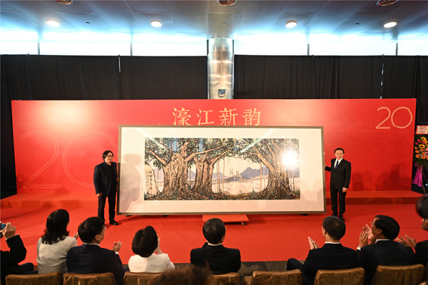 中国国家画院向澳门特区政府社会文化司赠送了由中国国家画院研究员林容生为本次活动专门创作的《榕树寄深情》。中国国家画院创作研究部副主任赵培智介绍,该作品寓意着澳门与祖国血脉相连,根连根、心连心,同时也祝愿祖国繁荣昌盛。