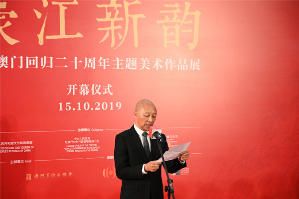 陆曦在开幕式致辞中表示,为了体现“一国两制”“澳人治澳”“高度自治”在澳门的成功实践,以及反映澳门回归祖国二十年来,社会和谐稳定、经济民生等各方面所取得的繁荣与进步,中国国家画院曾先后两次组织艺术家,专程来澳与港澳地区艺术家一起,深入各大街小巷、名胜古迹进行采风创作。期望今后双方能够有更多的合作,保持着艺术为广大人民服务的初心,共同携手朝着实现中华民族伟大复兴,共绘美好的中国梦而努力。