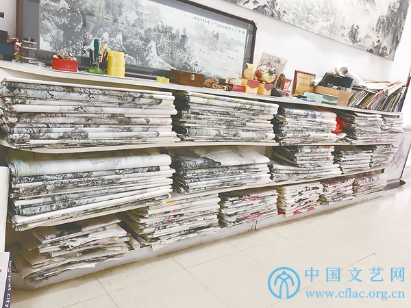 在李文才宽敞的书画创作大厅中,记者看到满墙悬挂的都是他创作的大幅焦墨山水画,与临摹传统山水、花鸟题材的农民画完全不同。李文才今年51岁,已经拿了47年毛笔。自幼看舅舅画画,李文才印象深刻,小小年纪,放假砍柴、制作竹编,在大山里就能发现美。李文才说,山有山脉,人有人脉,把脉抓住,印在大脑,就有了作品。他作画不用很多时间写生,每一幅都出自家乡。近20年来,受舅舅影响,李文才沉浸在焦墨山水之中,痴迷于用墨色表现大自然的色彩。“作画,虽苦犹乐。画焦墨,纸张成本是普通的几十倍甚至上百倍。画得入了迷,一天只吃一碗粉。”现在,李文才还免费带学生,只要愿意学,一分钱不收。他说,书画是写在内心的美与厚重,抛砖引玉,让五通的小朋友也喜欢绘画,给下一代留些好东西。