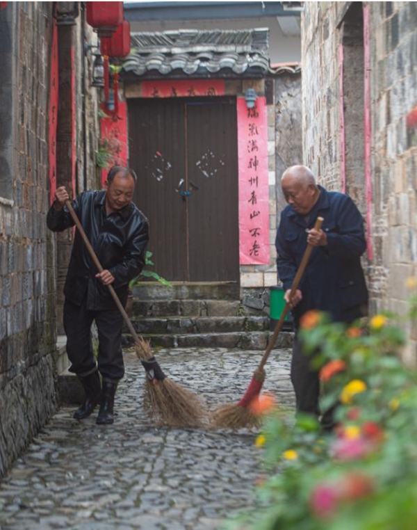 11月17日,大陈村村民汪须仓(左)、汪岩宣义务打扫村内的石板路。从2005年起,大陈村号召村民“美村必先洁家”,义务打扫也逐渐成为大家的一种习惯。新华社发(江汉 摄)