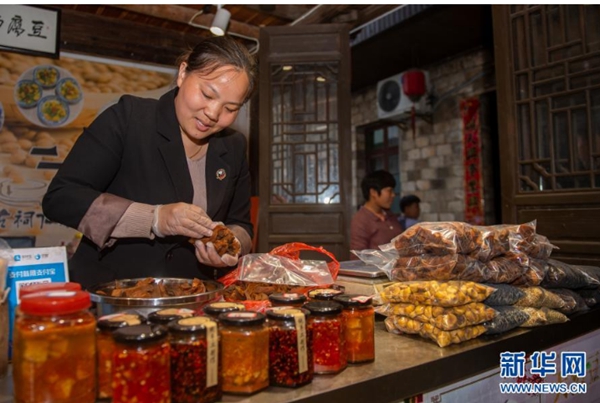 11月17日,大陈村村民汪晓玲在自家经营的土特产店内整理新鲜出炉的地瓜干供游客挑选。新华社发(江汉 摄)