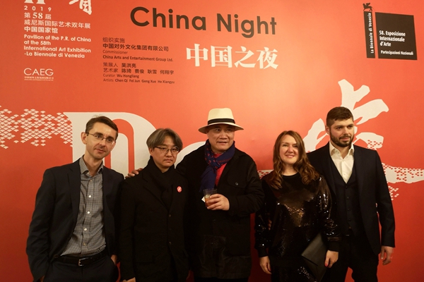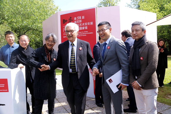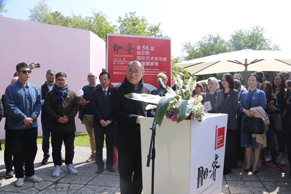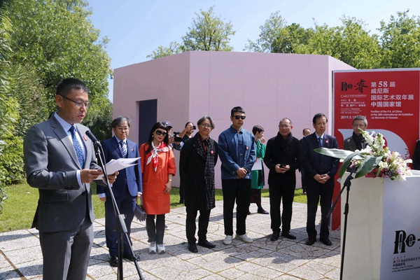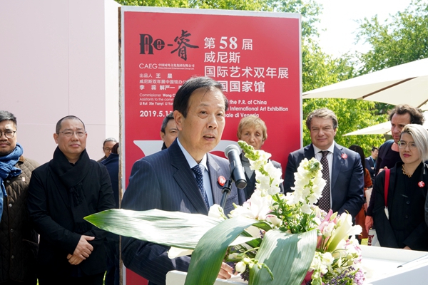 2019年5月9日(当地时间),第58届威尼斯国际艺术双年展中国国家馆展览“Re-睿”在意大利水城威尼斯的军械库和处女花园拉开帷幕。此次展览由中国对外文化集团有限公司组织实施。中国驻意大利大使李瑞宇,威尼斯双年展主席保罗·巴拉塔,中国驻意大利使馆文化参赞许蓉,里米尼机场基金会主席劳拉·芬卡托,威尼斯2000基金会主席朱利亚诺·赛格莱,威尼斯市市长代表马斯米拉诺·德·马丁,中国对外文化集团有限公司副总经理王晨,香港特别行政区政府代表、民政事务局常任秘书长谢凌絜贞,澳门特别行政区政府文化局局长穆欣欣,中国国家馆策展人吴洪亮及参展艺术家陈琦、费俊、何翔宇、耿雪作品合作者刘大鹏,中央美术学院美术馆馆长张子康,嘉德投资控股董事总裁及CEO、嘉德艺术中心总经理寇勤,景德镇陶文旅集团董事长刘子力、盈峰投资控股集团有限公司董事长、广东省和的慈善基金会主席、和美术馆馆长何剑锋等近300余人出席了开幕式。