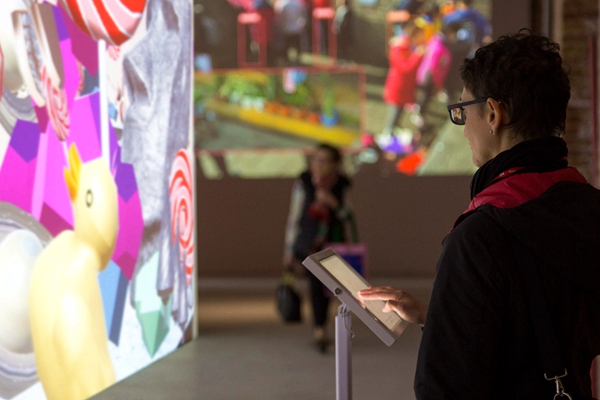 观众与艺术家费俊作品《有趣的世界》(装置一)进行互动 摄影:艺术家供图