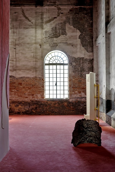 中国国家馆的展场位于军械库展区最深处,在威尼斯曲折的巷子和错综的水道桥梁之间穿行很容易迷路,为了让观众找到中国馆,艺术家费俊利用手机 App 创作了作品《睿·寻》,将威尼斯的桥与导航功能相结合,不仅可以游戏般体会人类过往创造中“桥”的相似,更能指引观者去往中国国家馆方向。走进中国国家馆后,观者首先必须穿过一条狭长的通道,这条通道的右侧是军械库历史建筑古老的斑驳砖墙,而左侧是一个与观者、玩家互动的,正在成长中的虚拟世界。这个《有趣的世界》简单而又错综复杂,有纠葛也有共创,它们会以桥相连,沟通彼此。走过历史沧桑与未来感对望的游戏世界,豁然是一片开阔的小广场,走上广场一侧圆拱形的小桥,可以站在整个展厅的制高点俯视艺术家耿雪的《金色之名》,这是一件影像装置作品。长 10 米高 4 米的视频作品,整个影片主体在绝对的黑白世界中呈现出这位女性艺术家对生命初始与轮回的关照。而在结尾时一艘金色的船,从黑白影像的虚空中漂来,呼应着地面上几朵金色如“水花”、如“脐带”的装置,其中的影像是一个金色的人漂浮、分解、羽化......水是这一区域的主题,无论观者在桥上还是桥下,都会透过漏窗,看到艺术家陈琦巨大的、超写实的、源自中国传统的黑白水印木刻作品《2012 生成与弥散》。如果观者走近它,甚至会融入其中,身与心同时荡漾起来。观者可以穿过桥,沿着窄窄的夹道进入一个完全意料之外的粉红色空间。这是艺术家何翔宇的装置作品《我们所创造的一切都不是我们自己》。此作将身体内部的触觉感知外化,他用舌头碰触上颚,再将触觉感受到的形状转译出来做成铸铜雕塑,数年间像日课一样持续完成这种身体知觉的可视转化。观者可以坐下来,触摸那些雕塑,达成与艺术家触觉的共知。此时,正是观者体会这个园林空间妙处的时候。观者或者穿过粉红色空间,经过拱门回到耿雪作品的小广场,也可以折返到桥下的出口,右拐,斑驳的光影从头顶蚀刻的曲折洞隙里洒下,这是艺术家陈琦的空间装置《别处》。这些光影的形态来自古书被书虫咬噬的虫洞,隐喻着人类文明与自然力量的冲突与和谐。走出这条光线幽暗的巷子,天光大盛,随即进入了中国国家馆的室外展场,花园的草坪上一只淡粉色的巨大盒子, 盒子内部却是阳光穿过“虫洞”投影出的虚静空间,它是送给观者的一份来自中国的礼物,可游可居。当然,如果观者恰好是从花园的入口进入中国国家馆,也一样能感受到这空间手卷的另一番景致,这是中国国家馆为观者建构的又一有趣之处。