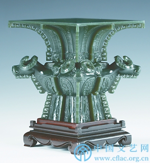 马洪伟之所以能够走上“青铜化玉”的艺术探索道路,他感谢自己所在的光福镇的自然环境、吴文化积淀的影响,让他能够在忙碌于急功近利挣钱还是静下心来做好自己的创作之间作出了更为明智的选择。“我能够用青玉做出有着青铜器韵味的玉器,也源于现代的工具改革。其实,在古代,也有用玉来做青铜器造型的,只是不能达到今天这样细腻的做工。”他将玉和青铜器型结合,是想融合祖先想要传播的文化。他说:“玉雕青铜器最为重要的就是青铜器韵味,而这依赖于器型和纹饰来实现。”