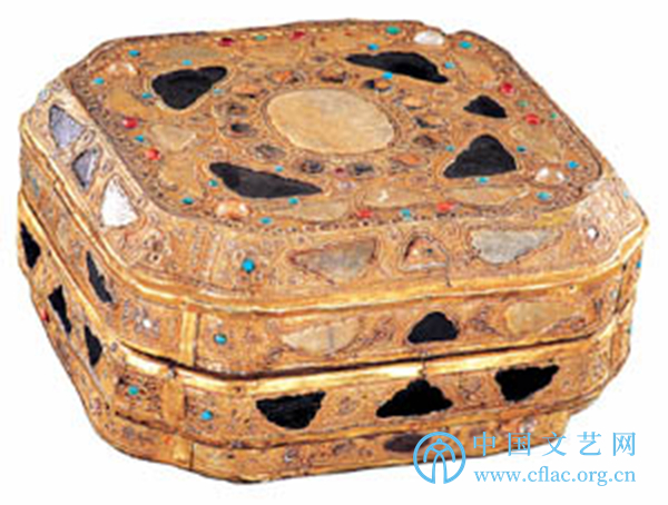 妆奁盒,盒内黑色漆胎,外以鎏金嵌宝石錾花银箔包镶。整体略呈曲角四方体,与内置铜镜造型相合。外表以镶嵌的玉、玛瑙、松石以及金银器錾花、锤揲等技术组成各式精美、华丽的图案纹饰。盖表图案寓意铜镜的镜钮、钮座以及镜面纹饰,构思精巧,装饰繁复。盒盖内镶有一层银箔,其上鎏金錾刻“庭院赏乐图” ,描绘墓主人生前场景。盒内放置飞凤纹四曲铜镜一枚,镜面分别阳铸“李家”“供奉”铭文。