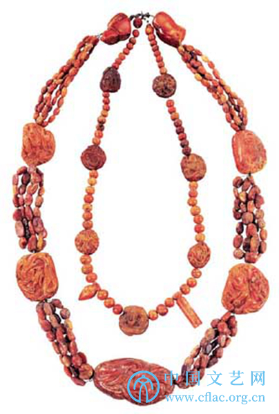契丹人崇尚琥珀,这套璎珞出土时位于驸马颈部,反映出辽代高级贵族对琥珀璎珞的喜爱。这套璎珞并不适合日常佩戴,应用于某些神圣和重要场合。璎珞由5小串257颗琥珀珠和5件琥珀浮雕饰件、 2件素面琥珀饰件以细银丝相间穿缀而成;内串69件,由60颗琥珀珠和9件圆雕、浮雕琥珀饰件以细银丝相间穿缀而成。