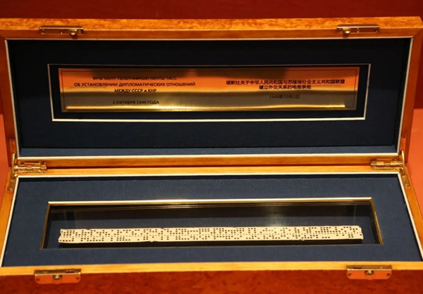 开国大典第二天,中苏建交,苏联成为第一个同新中国建立外交关系的国家,这是苏联政府决定同中华人民共和国建立外交关系的电报条纸,70年后它成为俄罗斯总统普京赠送给习近平同志的礼品。