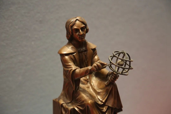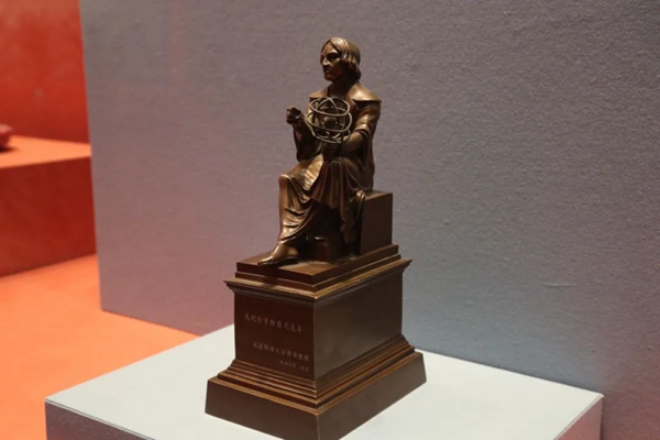 1953年4月至6月,被称为东欧之花的波兰马佐夫舍歌舞团来华访问演出,这是第一个访问新中国的外国演出团。歌舞团代表向接见他们的毛泽东同志,赠送了这个铜雕哥白尼像,雕像底座上写着:“为纪念考帕尔尼克年”。考帕尔尼克是波兰天文学家哥白尼的音译,这件铜雕哥白尼像以哥白尼家乡托伦旧城广场的塑像为原型,哥白尼端坐着,左手持经纬仪,右手持绘图圆规,目光坚定,似乎正在向众人解说着天体理论。波兰将1953年定为哥白尼年。