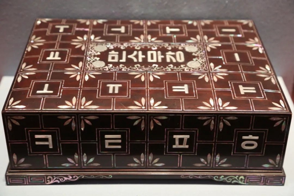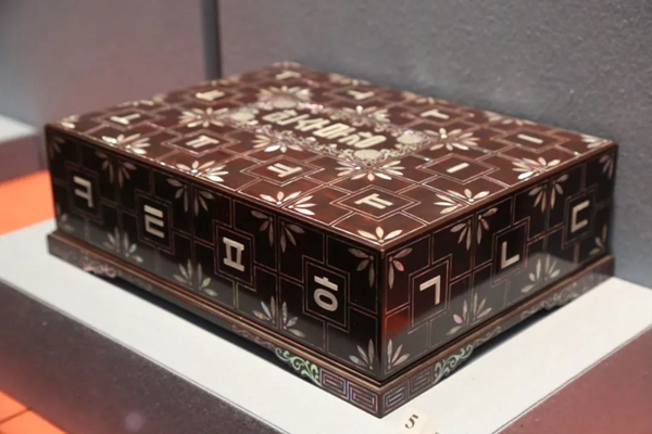 1953年11月,朝鲜内阁首相金日成率团访华,这年12月26日,是毛泽东同志60岁寿辰,金日成代表平壤市民向毛泽东同志赠送了这件木胎黑漆嵌螺钿方盒,盒面上用螺钿精心嵌成朝文祝词:“万寿无疆”,表达了朝鲜人民对毛泽东同志的真挚祝福和对中国人民的崇高敬意。
