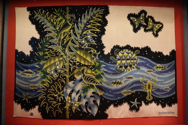 1964年1月,中法两国正式建交,法国成为了第一个与新中国建立正式外交关系的西方大国。这件挂毯是法国总统蓬皮杜1973年访华时,为毛泽东同志精心挑选的。它以法国二十世纪挂毯艺术的重要奠基者,让-皮卡尔·勒杜的作品为蓝本制作,描绘了亚马逊河悠长的水系和生物图案,展示了高超的绘画艺术和织毯工艺,留给人无限的遐想空间。