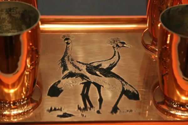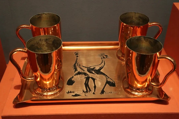 1974年2月,赞比亚总统卡翁达偕夫人第二次访华,抵京第二天,毛泽东同志就在中南海与他进行了会谈。会见前,卡翁达总统向毛泽东同志赠送了一盘四杯、由红铜制成的茶具。赞比亚是与中国建交较早的非洲国家之一,素有“红矿国”之称,常把铜制工艺品作为赠送外国领导人的首选礼品。这次会谈,毛泽东同志第一次阐述了著名的“三个世界”的战略思想,这对指导我国的外交工作发挥了重要作用。