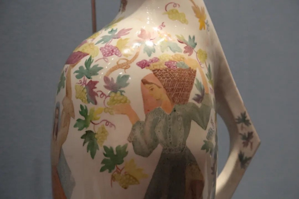 这件瓷壶整体造型独特,胸腹微鼓,口颈细长,足底收缩,具有秀丽圆润、浑然一体的审美效果。瓶体使用淡雅的釉彩和明快的笔触,描绘了一幅葡萄丰收的景象:在硕果累累的葡萄园中,美丽的罗马尼亚姑娘身着绿色民族服装,头戴粉色头巾,肩扛装满葡萄的果筐,左手上举抚筐,右手采摘葡萄,挂满青葡萄、紫葡萄的葡萄藤围绕四周,呈现出浓郁的罗马尼亚风情。