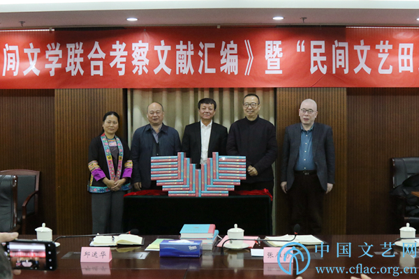 12月25日,由中国民协、社会科学文献出版社主办的《中芬三江民间文学联合考察文献汇编》发布会暨“民间文艺田野调查的历史与方法”研讨会在北京召开。图为中国文联党组成员张雁彬,中国文联副主席、中国民协主席、《中芬三江民间文学联合考察文献汇编》主编潘鲁生,中国民协分党组书记、驻会副主席、《中芬三江民间文学联合考察文献汇编》主编邱运华,社会科学文献出版社总编辑杨群,广西柳州三江县人大常委会副主任陈杏萍为新书揭幕。中国文艺网 李想 摄