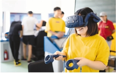 7月11日,市民在内蒙古呼和浩特市的内蒙古交通职业技术学校轨道交通实操室通过VR技术了解高铁科技知识。王正摄(人民视觉)