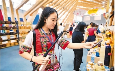 8月8日,创意云南2019文化产业博览会在云南昆明国际会展中心召开,少数民族姑娘艳琴在现场网络直播云南特色文创产品。新华社记者 秦 晴摄