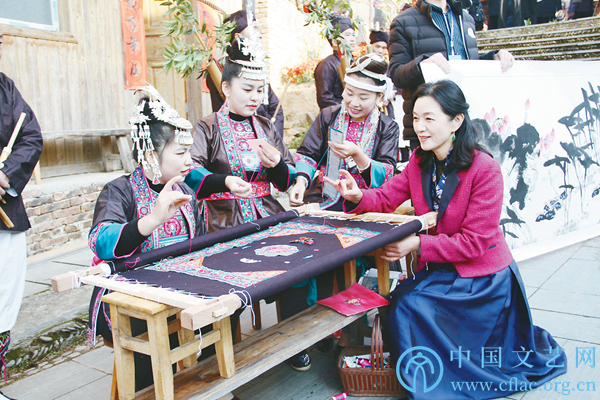 姚建萍与侗族绣娘交流刺绣技艺 宫剑南 摄