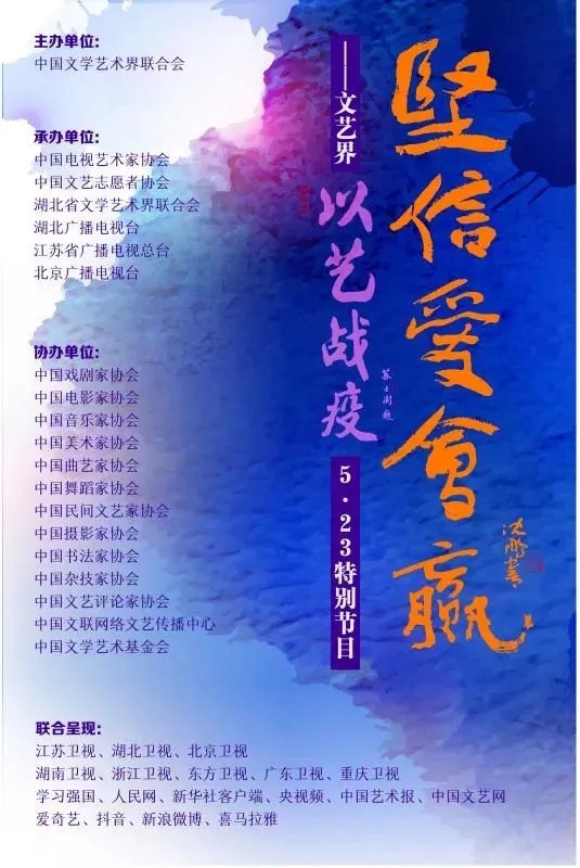 在毛泽东《在延安文艺座谈会上的讲话》发表78周年纪念日和第七个中国文艺志愿者服务日到来之际,为了向广大人民群众展现抗疫期间文艺工作者创作的优秀文艺作品,记录武汉开城后的勃勃生机,讴歌白衣战士的无私无畏精神,鼓舞全国人民必将战胜疫情的斗志,由中国文学艺术界联合会主办,中国电视艺术家协会、中国文艺志愿者协会、湖北省文学艺术界联合会、湖北广播电视台、江苏省广播电视总台、北京广播电视台承办的《坚信爱会赢——文艺界“以艺战疫”5.23特别节目》将在5月23日于江苏卫视、湖北卫视、北京卫视、湖南卫视、浙江卫视、东方卫视、广东卫视、重庆卫视等8家卫视及多家新媒体平台隆重推出。