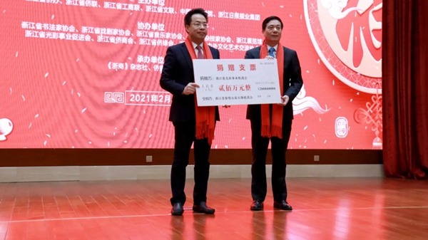 ▲ 熊建平为省光彩事业促进会、省侨商会颁发爱心认捐证书
