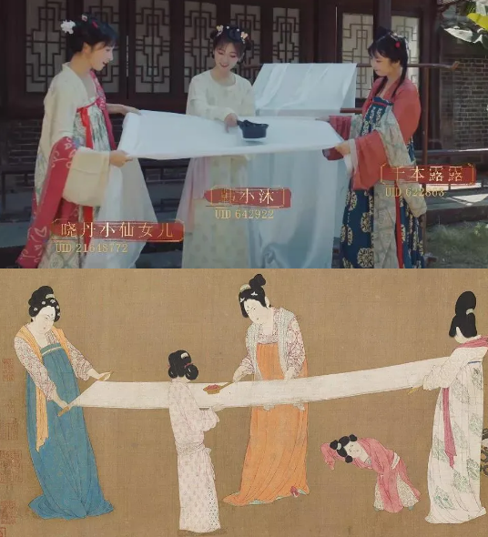 “秋节佳人图”之“浣纱捣衣图”原型来自唐代张萱《捣练图》