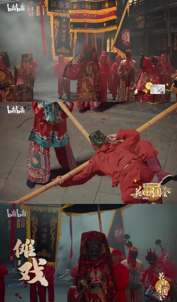 如果庭院中女子生活的“秋节佳人图”是“雅”的体现,“繁华市井”中的街头民俗表演则是“俗”的代表。两位女主角走过中秋夜人声鼎沸的“繁华市井”,草编、举鱼灯、皮影戏、川剧变脸、提线木偶戏等传统民俗表演你方唱罢我登场,看得人目不暇接。最受关注的“重头戏”则是傩戏“万载开口傩”。这种傩戏大约诞生于元末明初,是江⻄省万载县当地⺠间驱⻤逐疫、祈福求平安的一种⺠俗活动。作为傩戏源头的傩舞(鬼戏),是华夏文明中可考的最古老的一种祭祀活动,因此傩戏也是研究自然崇拜、巫术信仰时期的汉族先民为数不多的珍贵史料。本次演出团队便来自江⻄省万载县潭埠镇池溪村,共15人。表演中使用的具有现代艺术气息的面具,实则已有几百年历史。
