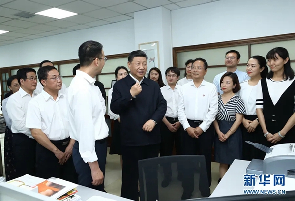 2019年8月21日下午,正在甘肃考察的中共中央总书记、国家主席、中央军委主席习近平来到位于兰州市区的读者出版集团有限公司,了解企业历史沿革、出版发行、经营管理等情况,看望《读者》编辑部工作人员。新华社记者 鞠鹏 摄