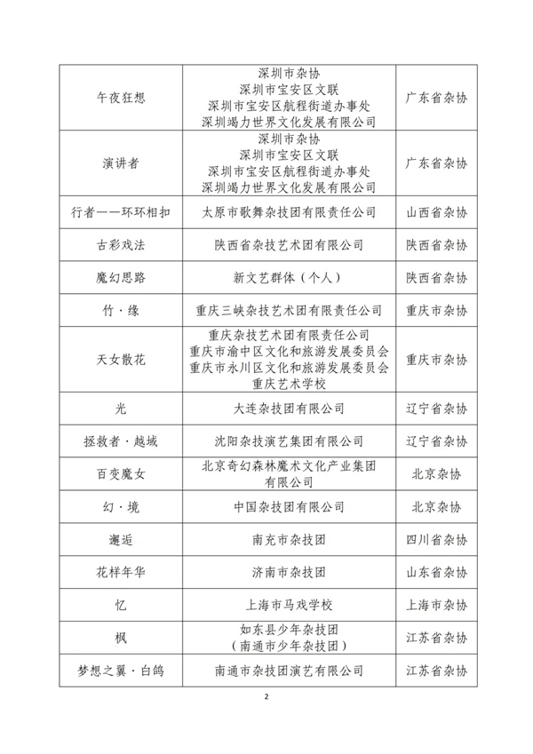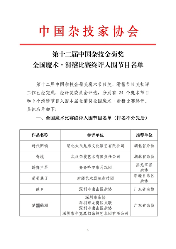 第十二届中国杂技金菊奖全国魔术·滑稽比赛终评入围节目名单