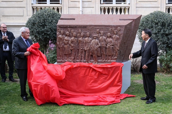 A sculpture of a group of Chinese revolutionaries is unveiled in the China Cultural Center in Paris, France, March 23, 2019. (Xinhua/Shan Yuqi)
