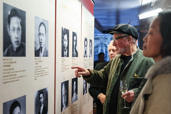 Visitors look at photos displayed in an exhibition marking the centennial of the work-study movement in the China Cultural Center in Paris, France, March 23, 2019. (Xinhua/Shan Yuqi)