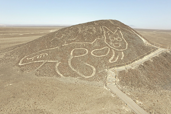A giant cat figure etched into a slope at the Unesco world heritage site in the desert near the town of Nasca in southern Peru. /CFP