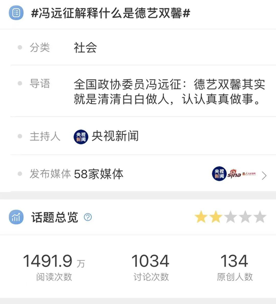 冯远征委员的话无疑对年轻的文艺工作者提出了新的要求。当天,#冯远征解释什么是德艺双馨#话题也一度登上热搜。