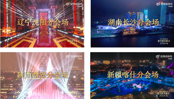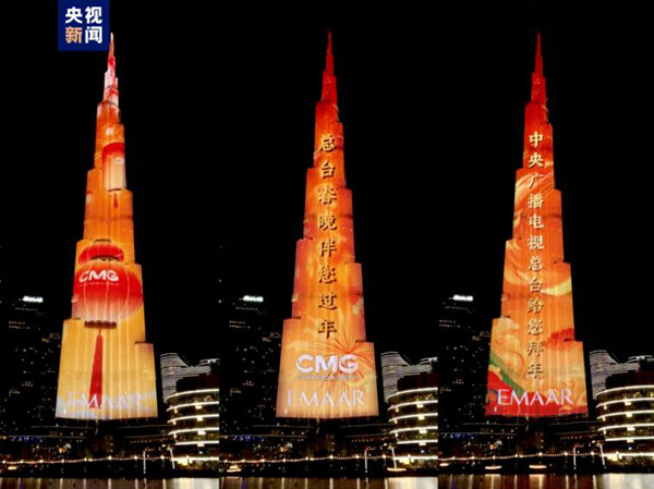 与此同时,在中国农历大年三十前夕,由中央广播电视总台制作的新春灯光秀在阿联酋迪拜市中心的世界最高楼哈利法塔亮相,向全球华人和各国民众送上总台新春的美好祝愿和诚挚祝福。在哈利法塔的光影交织里,由方正春晚龙行体排版的“总台春晚伴您过年”“中央广播电视总台给您拜年”“中阿携手四十载 共创辉煌”等祝福语的字样映入眼帘,作为春晚视觉设计的重要元素之一,最大程度还原总台春晚视觉组的创意思维,与春晚艺术设计交相辉映、和谐统一,借助汉字的文化纽带,展现中阿合作共赢的丰硕成果,表达对世界和平繁荣的美好期望。