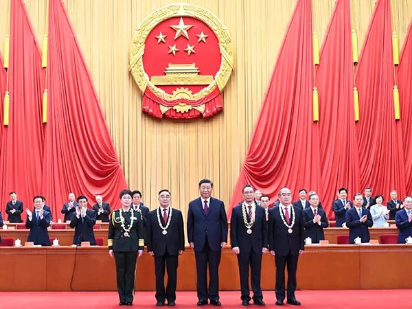 2020年9月8日,全国抗击新冠肺炎疫情表彰大会在北京人民大会堂隆重举行。中共中央总书记、国家主席、中央军委主席习近平向“共和国勋章”获得者钟南山(前排右二),“人民英雄”国家荣誉称号获得者张伯礼(前排左二)、张定宇(前排右一)、陈薇(前排左一)颁授勋章奖章。新华社记者 谢环驰 摄