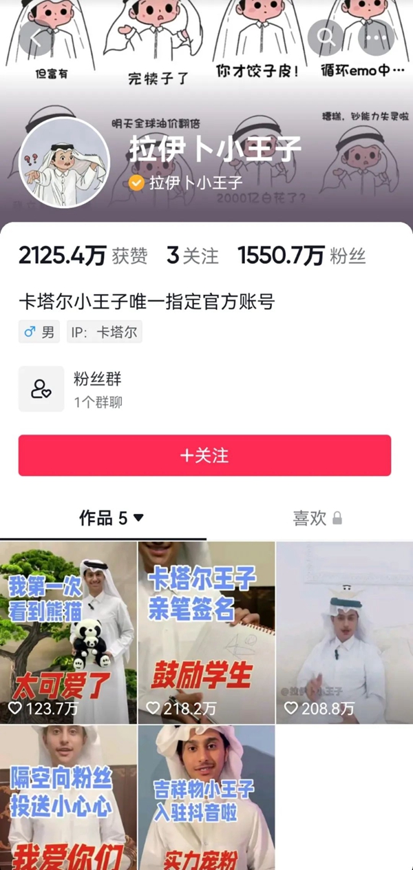 “拉伊卜小王子”可能是抖音有史以来涨粉最快的名人之一。“小王子”受邀入驻抖音的第一天,短短20小时内粉丝数便突破了1000万,要知道这粉丝数可是卡塔尔人口总数的3倍多。上一个在一天内粉丝破千万的,还是出道40年首次开设社交账号的刘德华。目前,“小王子”抖音粉丝数已经达到了1550余万,成为了名副其实的抖音新顶流。