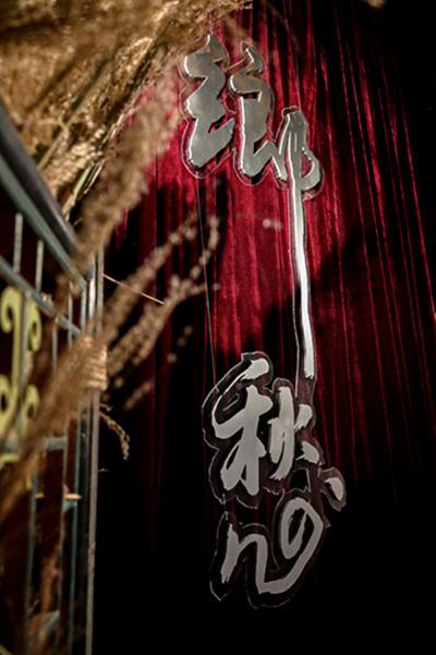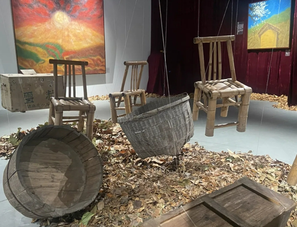 伍宇娟的装置作品构建了一个属于伍宇娟的“乡愁”世界,展厅的大门被伍宇娟的油画作品《乡愁98》中寻找家园的七只大象包覆,充满视觉冲击力,观众由此进入,充满童趣,又可以反省我们与自然的关系。酒红色的丝绒幕布则代表了伍宇娟曾经舞台演员的身份,与整个艺术空间的色彩相得益彰。四扇古老的屏风捆绑着刚刚从伍宇娟的故乡耒阳采摘而来的芦苇、丝茅,别具野蛮生长的挑战意味。整个展厅铺满了红叶和银杏,观者仿佛行进在伍宇娟童年与父亲一起走过的山路。