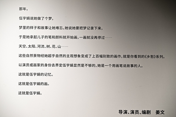 艺术展由伍宇娟的绘画、装置、电影三个部分构成。伍宇娟的53件绘画作品首度公开亮相。从未进行过专业美术训练的伍宇娟以自由的想象力和充满激情的笔触,建构了一个属于她自己的艺术世界。