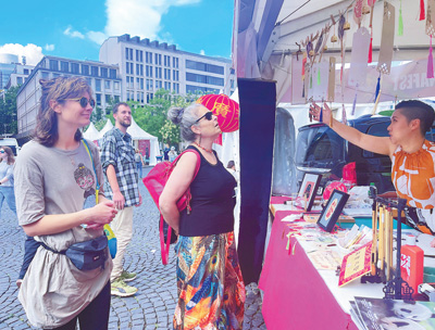 8月2日至4日,第四届法兰克福中国节在德国法兰克福市举行。图为当地市民和游客在欣赏中国手工艺品。人民日报记者 刘 赫摄