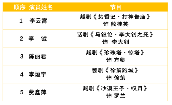 据了解,“金桂奖”决赛共分两场举行,分别是下午场(14:30)和晚上场(19:30)。其中李云霄将在下午场首位出场,表演越剧《焚香记·打神告庙》,陈丽君则将在第三位出场,表演越剧《珍珠塔·惊塔》。